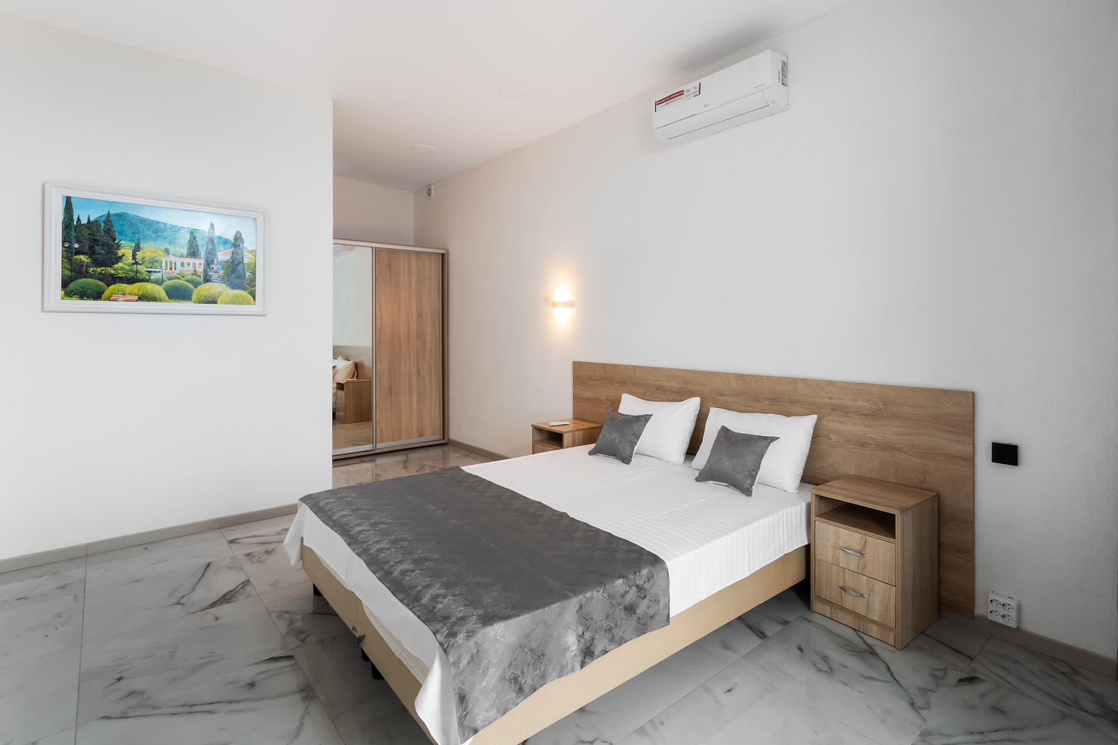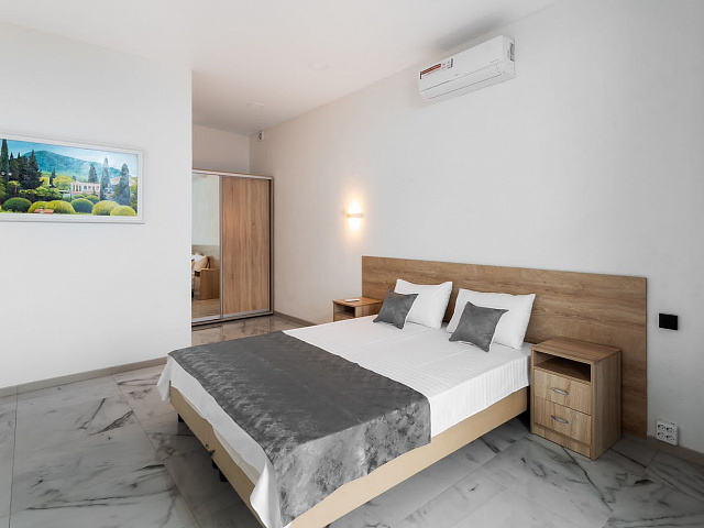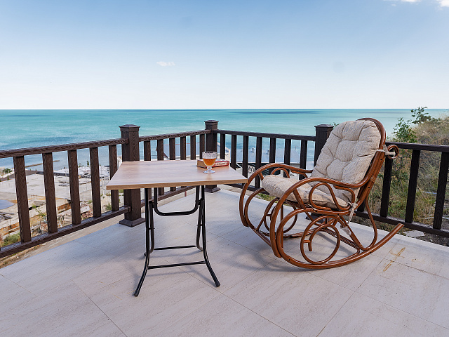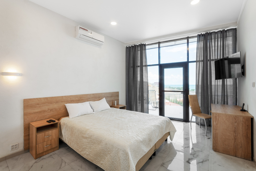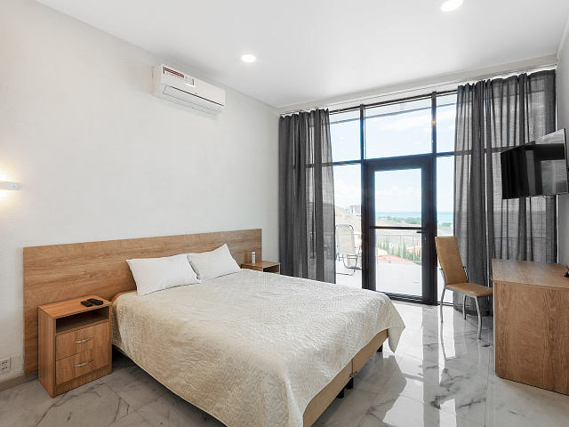Позвольте себе остановить мгновение. Номер «Стандарт Горизонт» — это ваш личный уголок спокойствия на возвышенности Алушты, где главным украшением интерьера становится бесконечная морская даль. Здесь, в тишине и уединении, время замедляется, а линия горизонта, разделяющая небо и море, становится источником умиротворения и вдохновения.