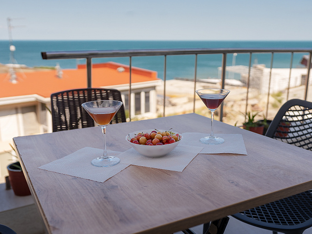 · Прямой выход на просторную общую террасу, которая служит продолжением вашего отдыха — место для релаксации с панорамным видом на море.