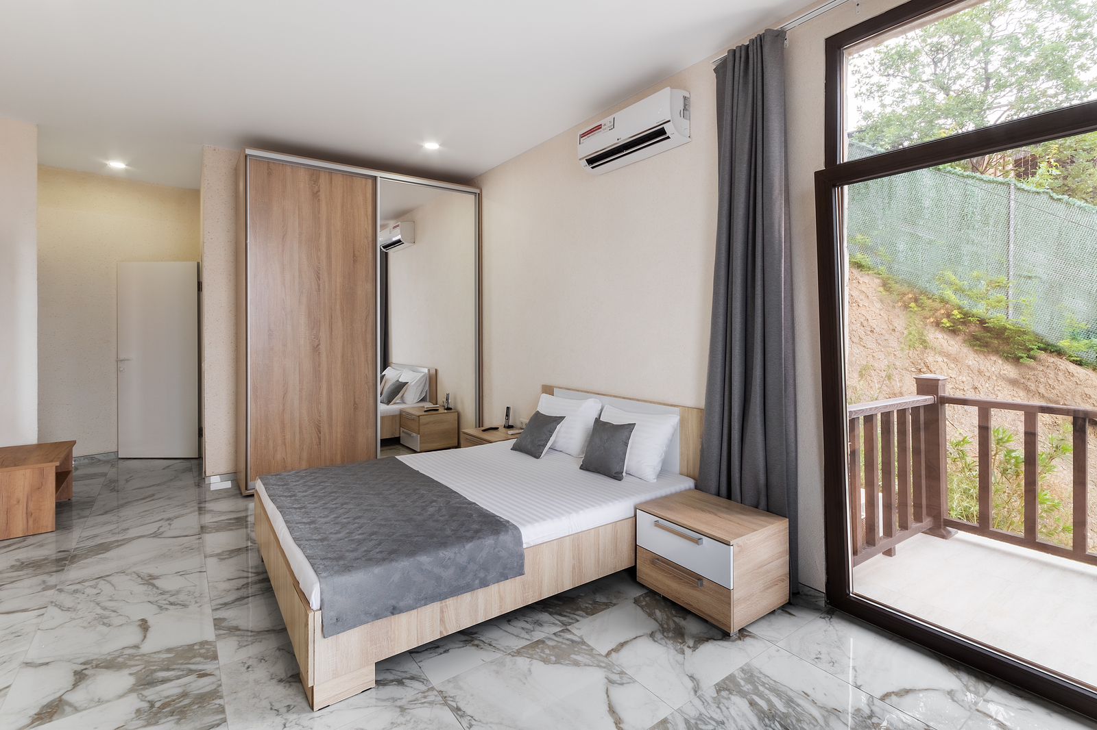 · Мебель: Удобная двуспальная кровать, стулья, стол, тумбы, шкаф для одежды.