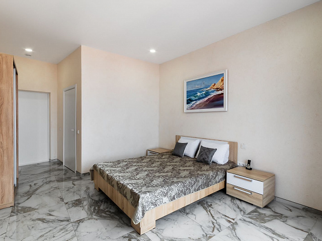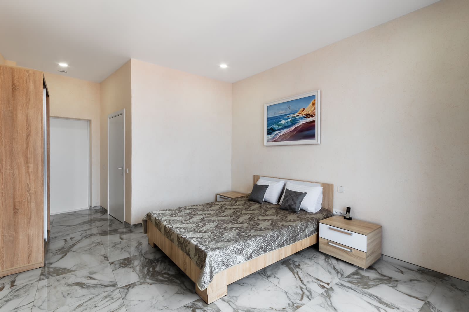 · Мебель: Удобная двуспальная кровать, шкаф для одежды, тумбы, стол и стулья.